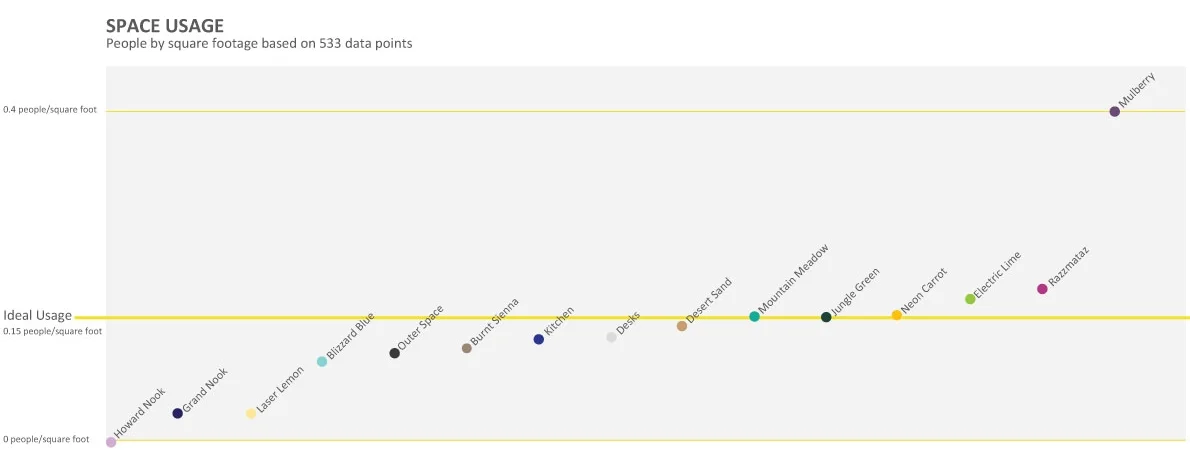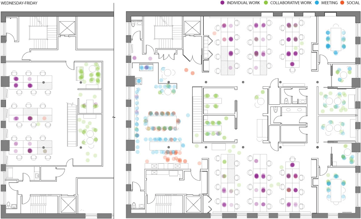 A growing digital strategy and design company had plans for expanding their space but acknowledged that given their changing business model and the evolving work habits of their employees, they did not know what kinds of spaces to plan for. To answer this question, I developed a multi-pronged research plan, which included documenting the location and general activity of each person in the office over the course of three days. During this time, I also documented the objects located in each space and how they were being used.